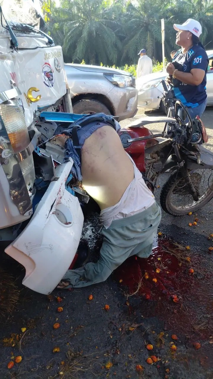 A motorcyclist was killed after being struck by a truck, which sent him crashing into a tractor loaded with African palm fruit.